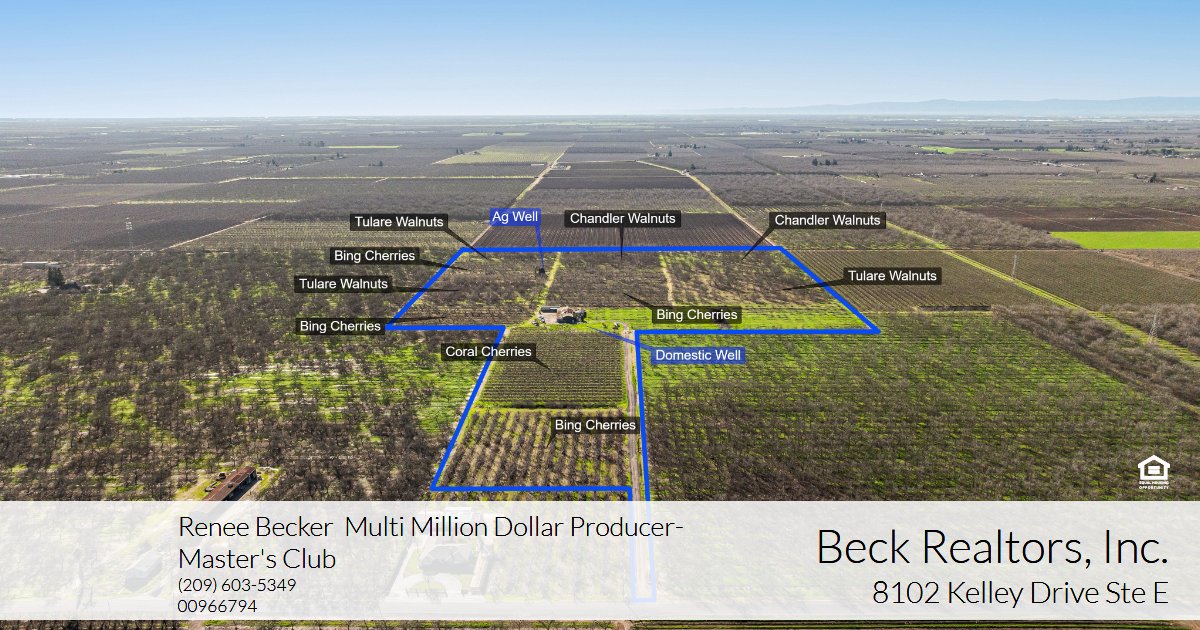 Prime Location, 47.89 Acres with combine Walnut & Cherry Orchards. Approx. 22.9 acres in Cherries, Coral & Bing. Approx. 20.8 acres Chandler & Tulare. Remaining approx. 5 Acres in roadway, bare ground, mobile home sites, old barn & nursery trees. AG Well, Domestic Well & Septic Systems.