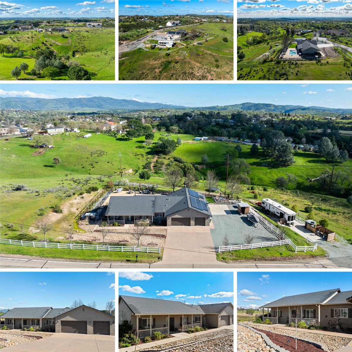 Spectacular end of the road location with stunning panoramic sunrise and sunset views from this 3.1 acre parcel in the Sierra Foothills. Hard to find single story 4 bedroom, 2 bath home with open floorplan plus 3 car attached garage, extra parking for all your toys and RV parking with 50 amp hookup. Entertaining is made easy with the interior featuring a huge granite dining counter surrounding the kitchen, large formal dining area, built-in bar in one corner of the great room that features vaulted ceiling and raised rock hearth with woodstove. The large primary bedroom features a sitting area perfect for an office or nursery area. Primary bathroom with walk-in closet, double sinks, jetted bathtub and tile shower with two shower heads. The entertainment features don't stop inside; the covered back patio with wood ceiling and fans is the perfect place to relax and BBQ or cool off in your beautiful built in Pebble Fina finish pool with beach entry and automatic safety cover and then warm up in your personal hot tub. Front and back landscaping with automatic sprinklers/drip, raised garden beds, two dog run areas, deck for watching the amazing sunsets all complete this turnkey property.