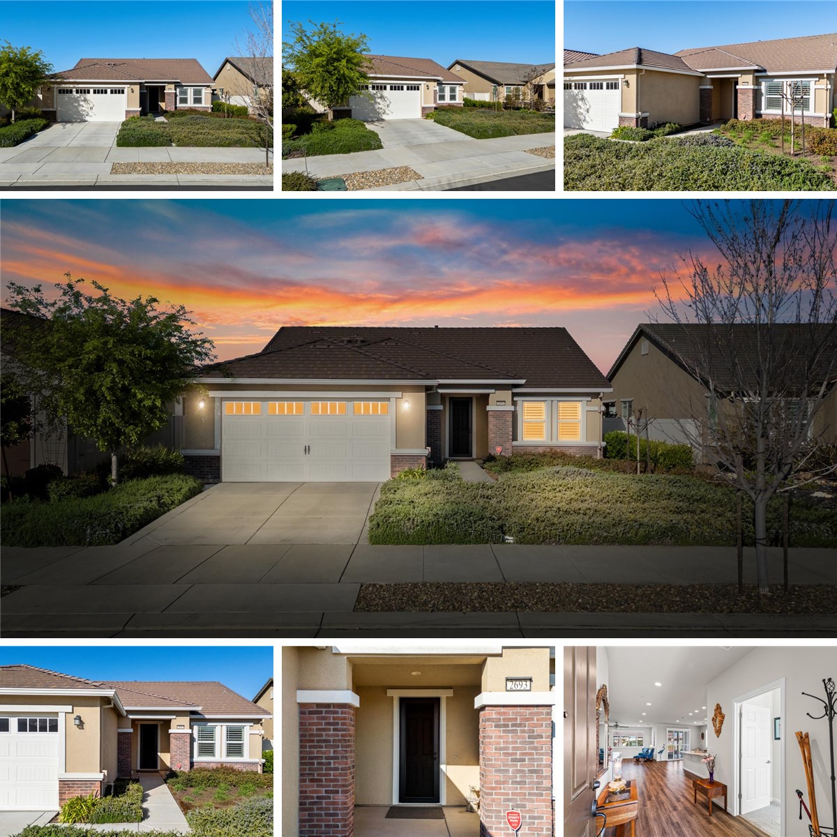 Enjoy luxury living in the prestigious Del Webb/Woodbridge Active Adult Community at this GREAT NEW PRICE! Uniquely designed Pioneer Model, immaculate and bright with Rare 3 FULL bedrooms, PAID Solar and beautiful custom rear landscaping. Light open kitchen with modern white cabinets plus adjacent built in buffet cabinet. Granite counters, stainless steel appliances (fridge stays!), and custom pantry door. Upgraded ceiling fans and light fixtures throughout. Inviting gas fireplace, plantation shutters, extra light package, clean paint and front security screen door. This open floor plan was designed with entertaining in mind and has a great flow with warm laminate flooring. Spacious primary bedroom and bath featuring a walk-in closet with mirrored doors. All bedrooms have quality carpet + pad. Backyard is serene and private with covered patio and ceiling fan, beautiful landscaping with remote water feature and lifetime vinyl fencing. Fully finished garage. Bask in everything this community offers including 2 Pools, tennis, putting and chipping courses, pickle ball, bocce ball, professional gym, indoor walking track, fishing, classes, activities and tons of events! Enjoy our virtual staging of this beautiful home.