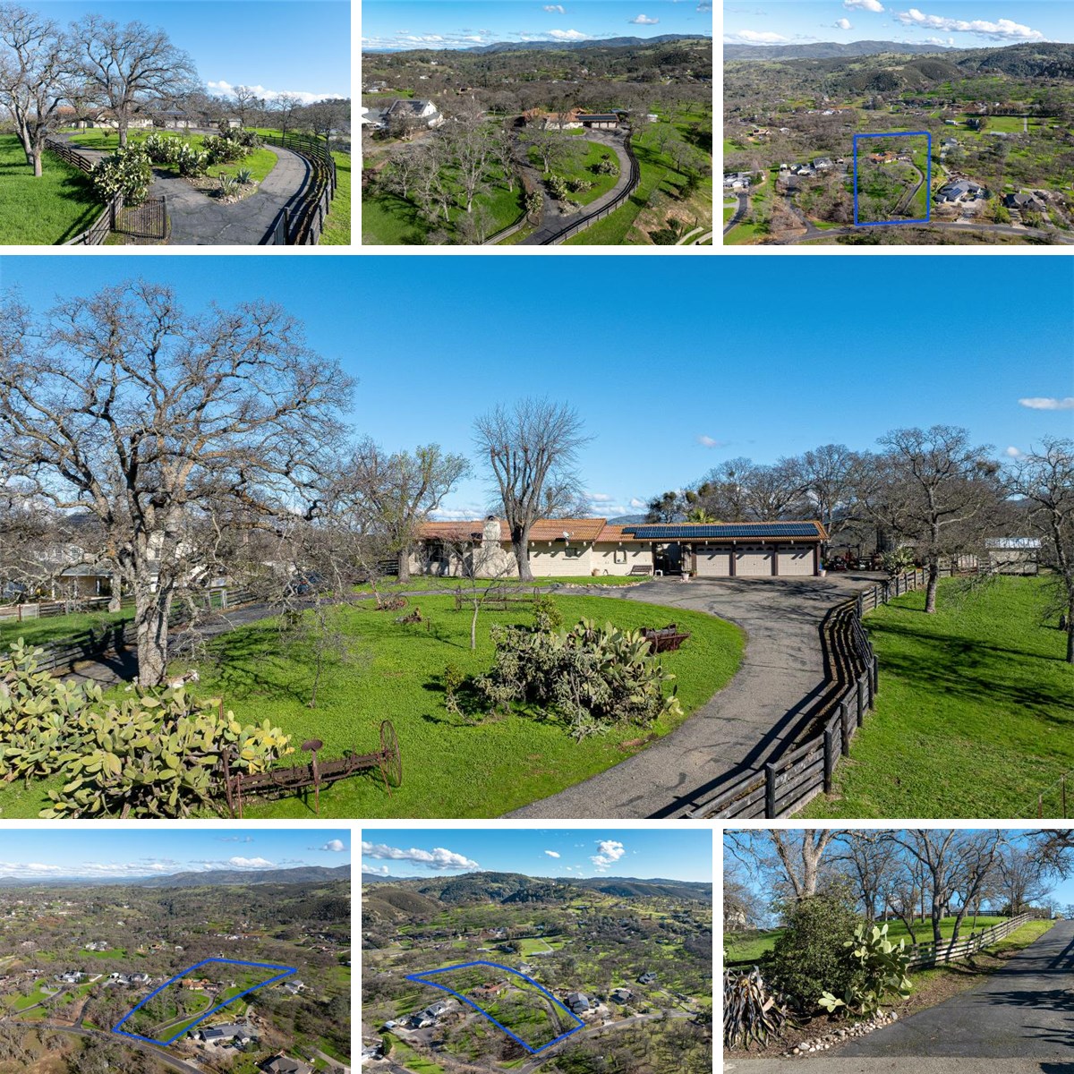 Panoramic valley and sunset views from this Spanish style home sitting on usable 3.68 acres fenced and loaded with oaks, perfect for livestock. The courtyard with water fountain is the centerpiece for the detached second primary suite featuring Spanish tile floors, vaulted wood ceiling and full bath. As you enter the main home, the living room is a grand space, featuring a fireplace insert that serves as a warm focal point, vaulted beamed ceiling that complements the wood ceiling, while the wood framed door and entry casings add a touch of rustic charm. The bedroom provides a personal retreat, enhanced by the refined touch of crown molding and real oak wood floors adding architectural interest. The kitchen is equipped for culinary adventures, boasting tile granite and wood countertops that provide ample workspace and a high-end range oven. Large walk-in pantry offers an abundance of storage while the 1/2 bath, office/den, inside laundry room and sitting area complete the floorplan. Three car garage, metal carport, storage shed, animal shelter, paved driveway and entry gate all enhance this property. Embrace the opportunity to make this exceptional Calaveras foothill property your personal haven.