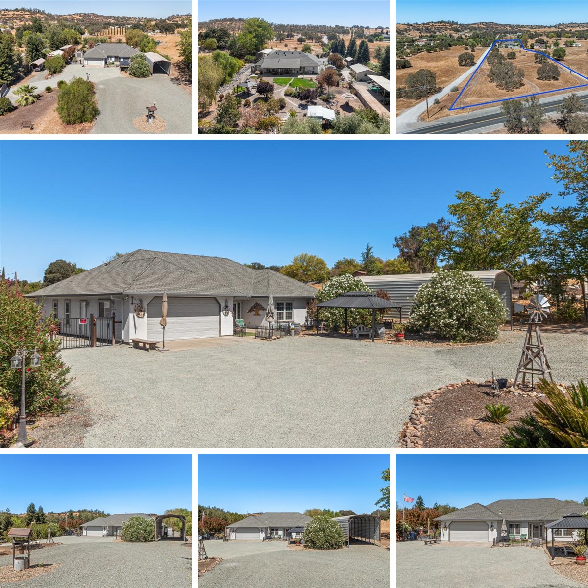 Hard to find single story custom built home on usable 5 acres with a 18X35 metal shop, 40 ft metal RV cover, 40X12 metal carport and detached boat storage. This quality home features an open floorplan with formal entryway, living room boasting a gas log fireplace on raised hearth with rock surround and built in display shelves. The kitchen is the centerpiece of the home with large raised countertop island, SS appliances including double oven, 5 burner gas cooktop and trash compactor. Formal dining area, inside laundry room, walk-in pantry, possible 4th bedroom with attached full bath, two spacious spare bedrooms, hall bathroom, primary suite with outside access and primary bath with walk-in closet complete the floorplan. The fenced back yard is an oasis with large covered patio, personal spa, lawn area, a variety of mature trees, grape vines, gazebo, firepit, chicken coop and storage sheds. Property is fully fenced with front pasture area for large or small animals. Live where you play just minutes from 3 beautiful lakes, hiking trails and La Contenta golf course. Location is perfect for an easy commute to the valley.